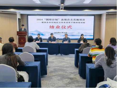 2024年11月16日,为期20天的2024“国培计划”——肥西县农村地区小学英语骨干教师培训班顺利结业。结业仪式由培训班班主任李超主持,纽约国际967线路测试党委书记马四民、副院长吴礼敬、授课教师陈英、项目负责人茆莹莹和30名参训学员参加。