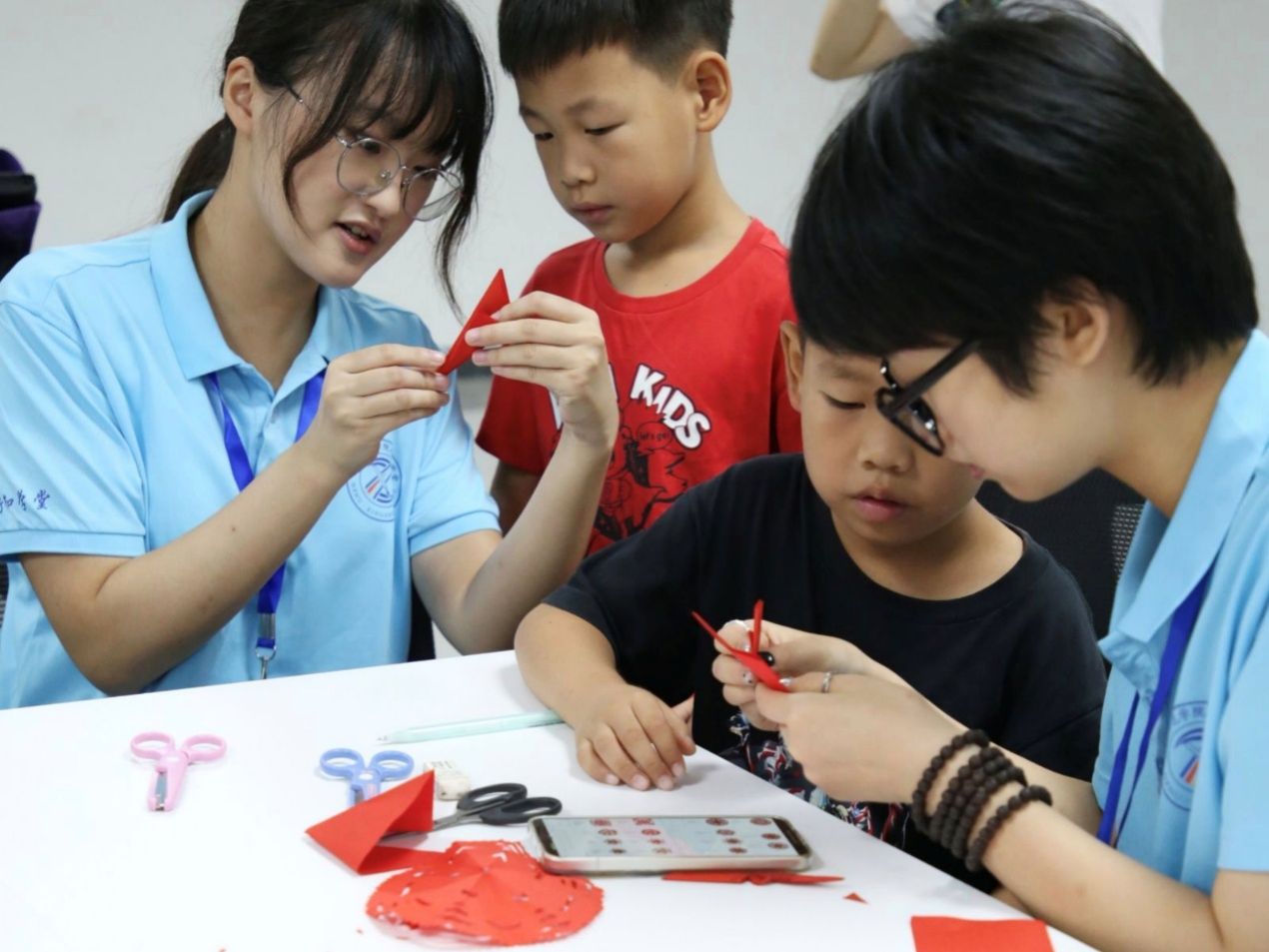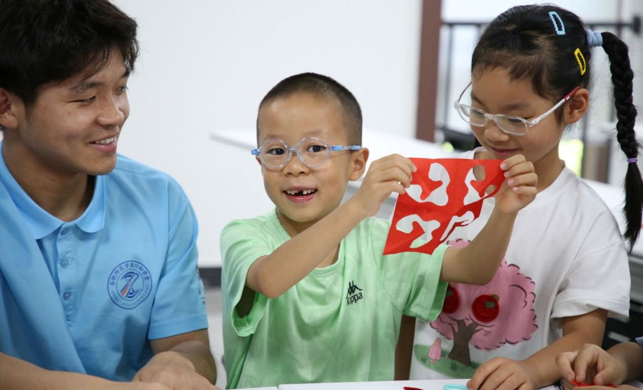 剪纸课程环节同样精彩纷呈,来自纽约国际967线路测试的袁贺文佳小先生化身文化使者,展示了风格各异的剪纸作品。从古老民间传说的艺术呈现,到现代装饰艺术的独特表达,她用生动的讲述打开了小学员们通往剪纸艺术世界的大门。随后,音乐学院的倪妍小先生手把手教导小学员们折纸、握剪刀,传授剪出精美线条和图案的技巧。小学员们全神贯注,在一折一剪间,一张张彩纸幻化成栩栩如生的花鸟、可爱的动物和寓意吉祥的文字,仿佛是传统文化在他们手中焕发出新的生命力。